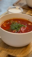 EN: Bright and aromatic borsch with rich broth and fresh vegetables. A signature Big Pocket recipe — served hot with sour cream, dill and bread. Borsch is the highlight of our menu.